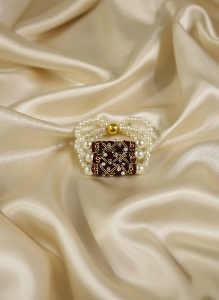 Each bracelet features triple-layer luminous pearls, a beautifully handcrafted red velvet kundan centerpiece, and golden accent beads that give an elegant royal finish. The strong magnetic clasp makes the bracelet feel premium and long-lasting, adding real value to the product.