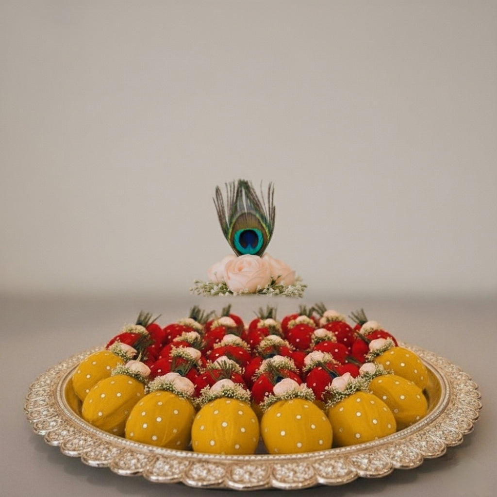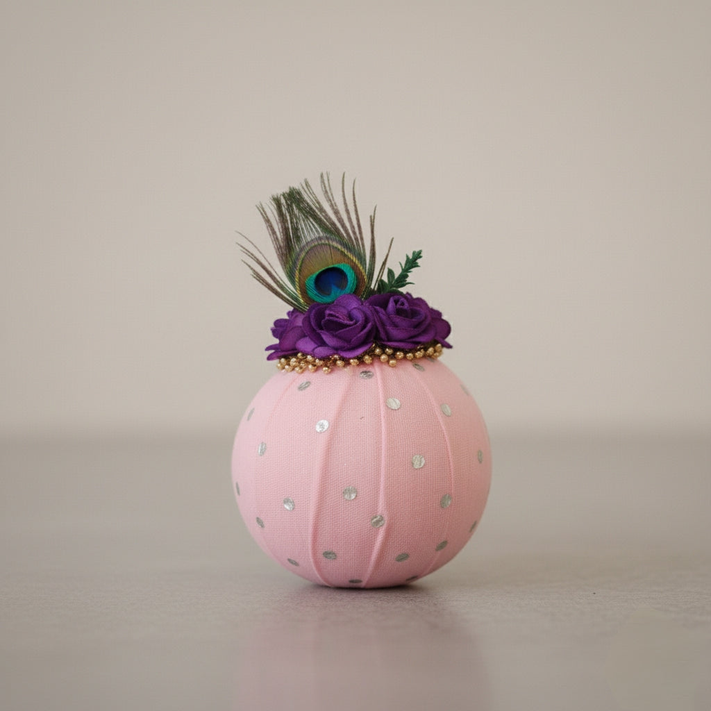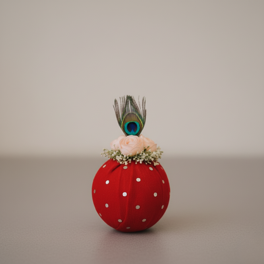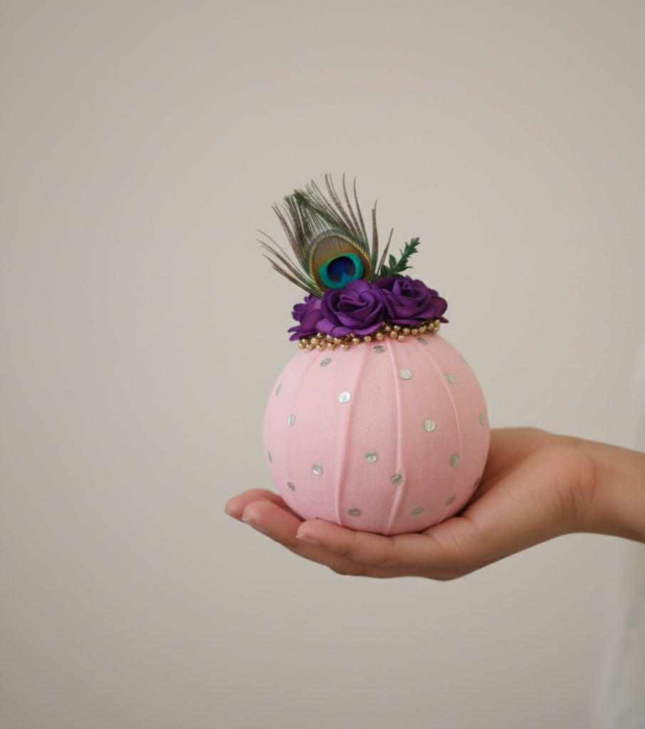 Floral & Peacock Feather Detailing: Topped with delicate artificial blossoms and a symbolic feather — a mark of purity and auspiciousness.