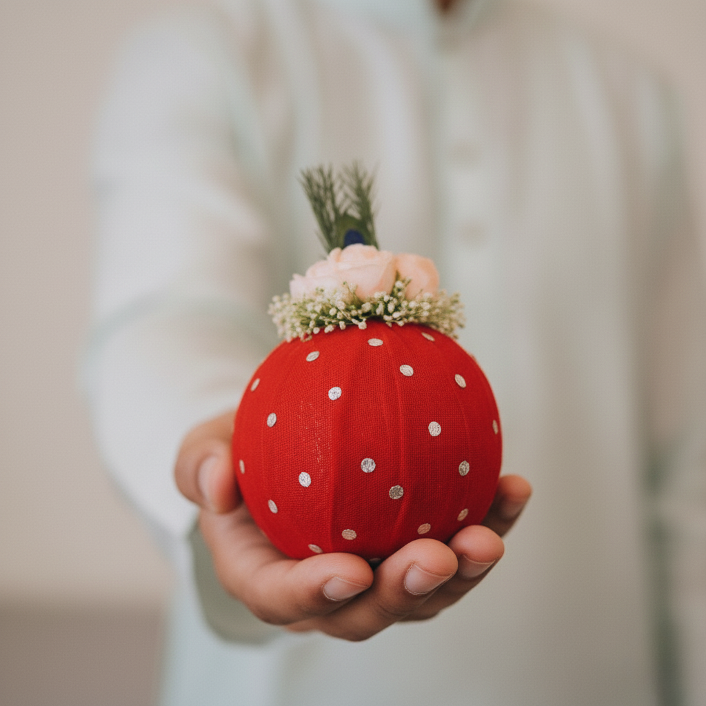 Each real coconut is artistically hand-decorated with vibrant red fabric, silver polka accents, and elegant floral arrangements topped with a symbolic peacock feather — representing purity, prosperity, and divine blessings.