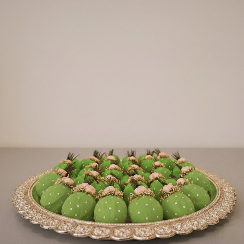 Arranged collectively on a decorative silver thali, these handcrafted pieces transform into a breathtaking centerpiece that elevates your ceremonial setup or gifting presentation.