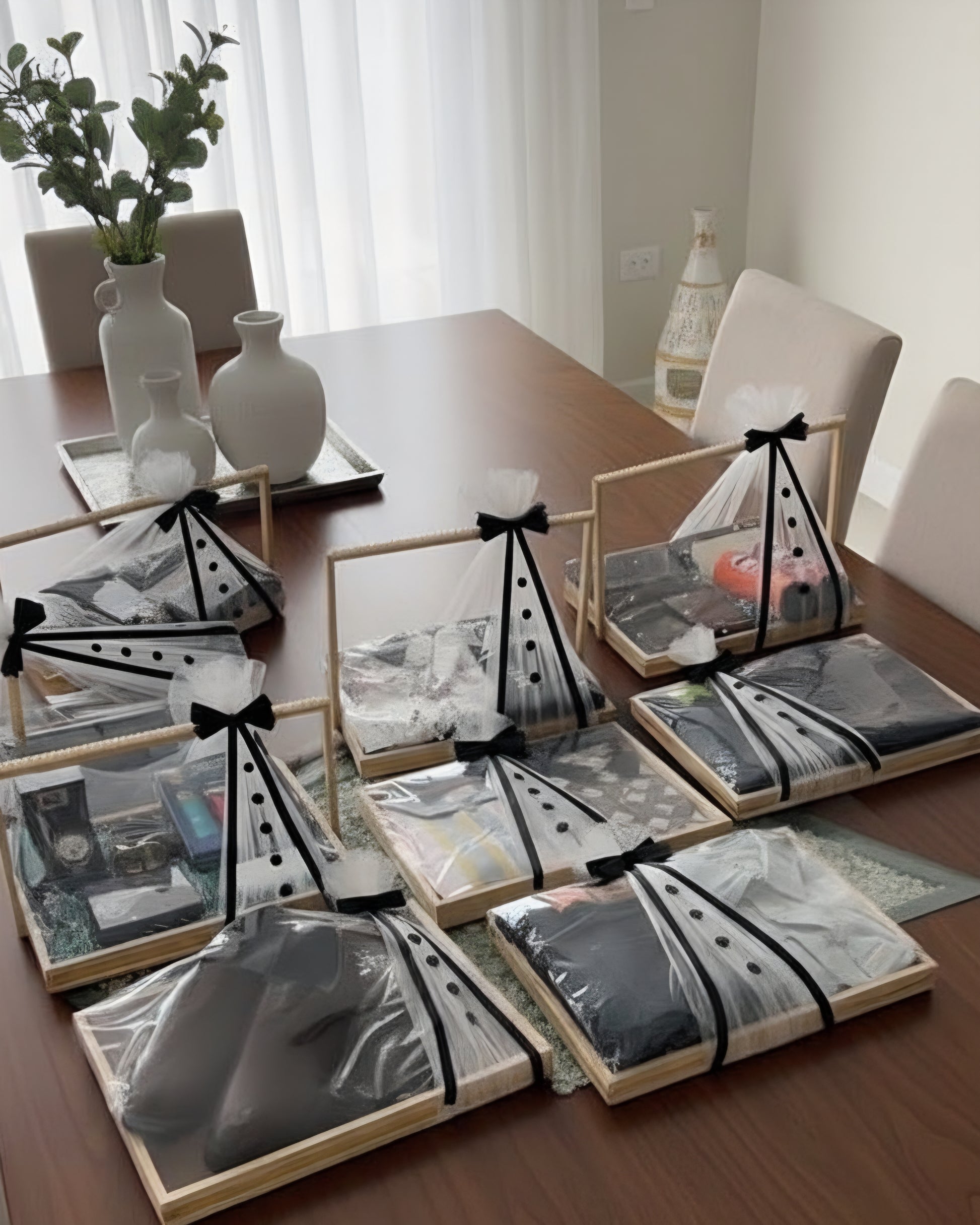 Redefine elegance with our luxurious handcrafted wooden tray packaging, specially designed for wedding trousseau and ceremonial gifting. Each tray features a premium pinewood base beautifully wrapped in transparent cellophane with a soft white tulle overlay, finished with sleek black satin ribbons and bows — creating a perfect blend of modern minimalism and timeless grace.